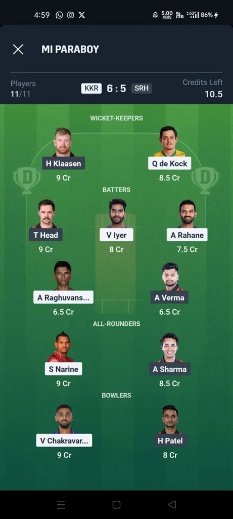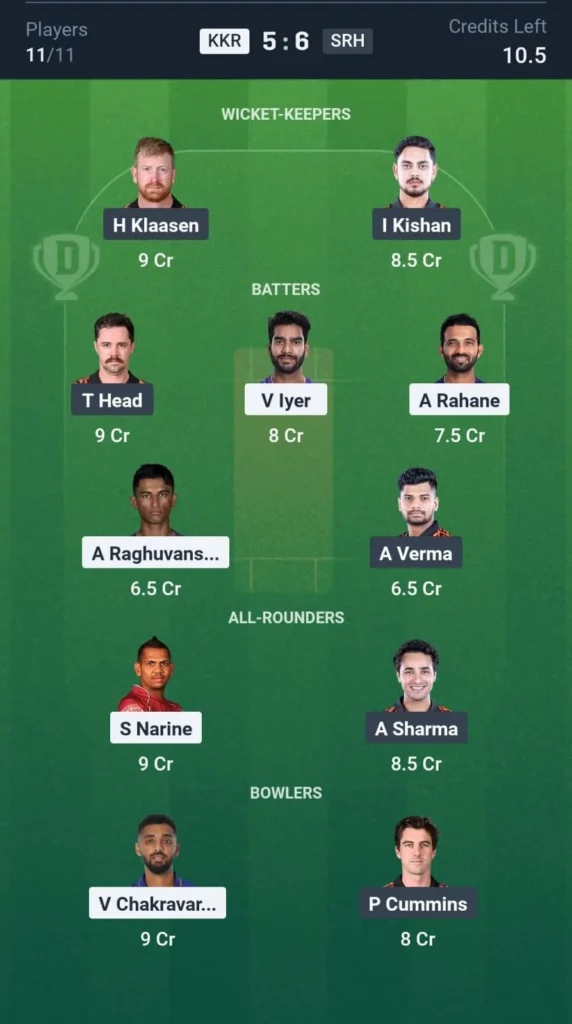 KKR vs SRH Dream 11 Team for H2H
