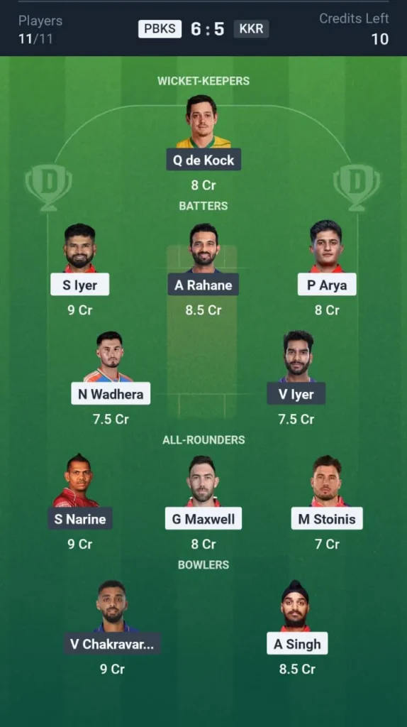 Punjab Kings: Priyansh Arya, Prabhsimran Singh, Shreyas Iyer, Nehal Wadhera, Shashank Singh, Glenn Maxwell, Marcus Stoinis, Marco Jansen, Yuzvendra Chahal, Arshdeep Singh, Lockie Ferguson