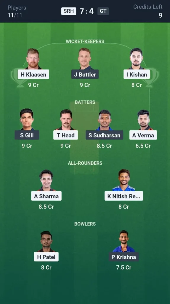 Sunrisers Hyderabad: Abhishek Sharma, Ishan Kishan, Nitish Kumar Reddy, Heinrich Klaasen, Aniket Verma, Kamindu Mendis, Pat Cummins, Simarjeet Singh, Harshal Patel, Mohammed Shami, Zeeshan Ansari