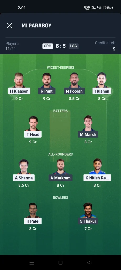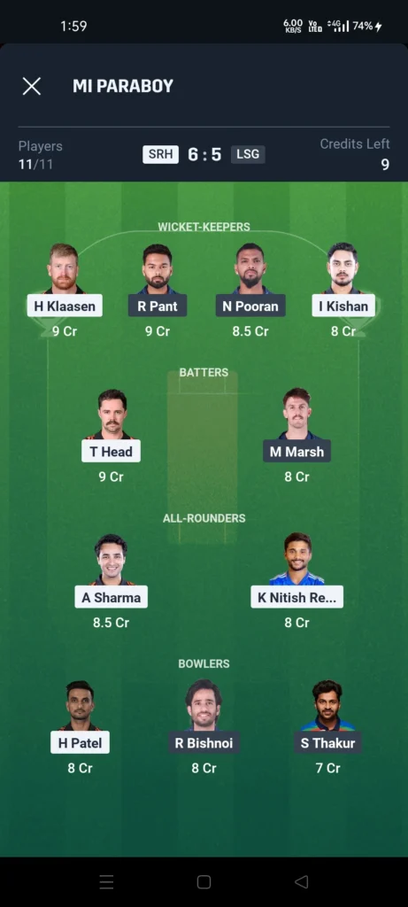 SRH vs LSG Dream 11 Team for Mega League